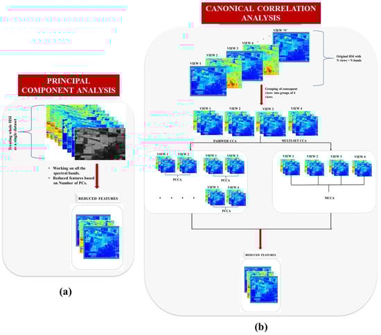 CCA and PCA can be considered as sister techniques. However, PCA ignores the loss of information and lack of interpretation of the principal components in terms of original features. A brief abstract overview and difference between PCA and CCA has been depicted in Figure 1. Since it can reduce the labeled instance complexity, CCA, which was first developed to measure the linear correlation between two sets of variables, was formally described as a multi-view dimensionality reduction technique by Foster et al. []. An additional attractive feature of CCA is that in the event that noise in one view is uncorrelated to the other, the learnt subspace will not contain the noise in the uncorrelated dimensions [].