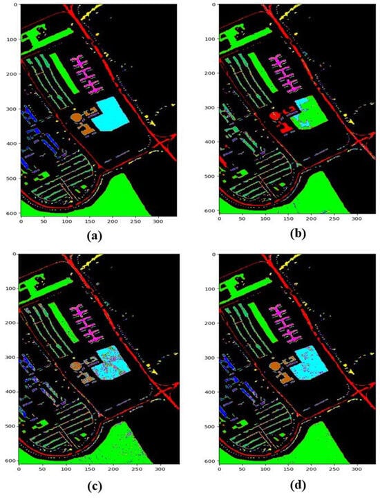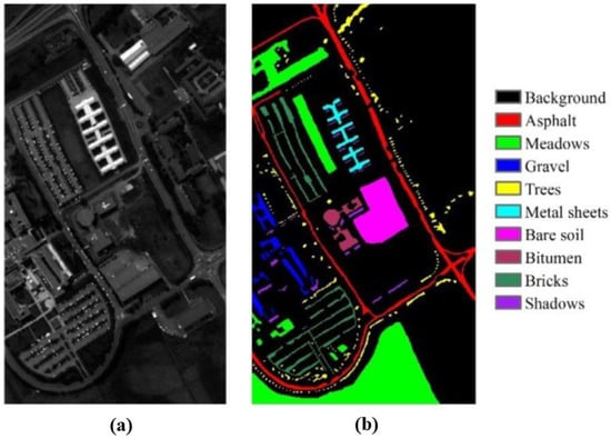 The ROSIS sensor uses a flight above Pavia, Italy, to capture the scene at Pavia University. The scene resolution was originally 610 × 610 × 115, however, some areas of the image were removed since they were missing information, leaving 610 × 340 × 103 as the final resolution. As illustrated in Figure 3, it comprises nine distinct classes and has a geometric resolution of 1.3 m. Radiometric adjustments involve the removal of 12 bands.