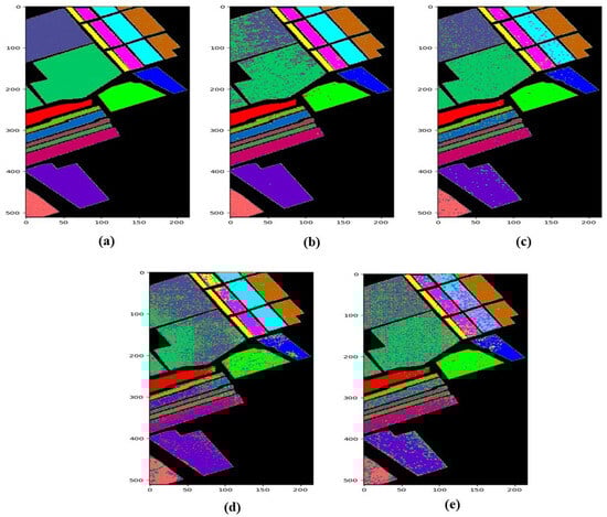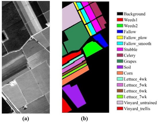 The Salinas scene, with a high spatial resolution of 3.7 m per pixel, is located in California. This scene is recorded by the AVIRIS sensor. It has a resolution of 512 × 217 × 224. Removed are the bands ranging from 108 to 112, 154 to 167, and 224. There are 204 bands on the updated picture. Figure 4 illustrates its 16 classes, which include stubble, Romaine lettuce, green broccoli weeds, and fallow.