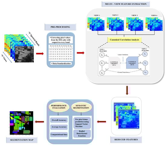 The hyperspectral image is envisioned to be segmented by utilizing the hyperspectral data’s block structure in a multi-view manner. The entire hypercube is automatically divided into disjoint sub-blocks along the spectral dimension. An overview of the proposed technique to perform semantic segmentation on HSI is shown in Figure 5.