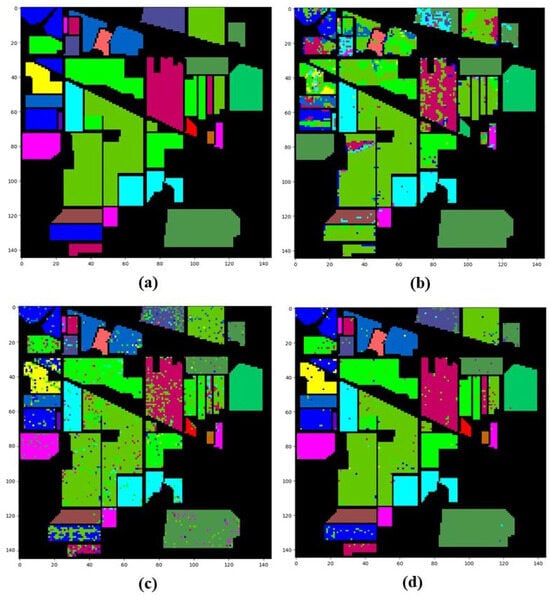 Indian Pines is situated in Indiana, USA. This landscape, which includes lush, agricultural land, vegetation, and a natural woodland area, has a total resolution of 145 × 145 × 224. The water’s ability to reflect and refract light causes the water’s absorption bands to disappear. Bands 104 to 108, 150 to 163, and 200 have been eliminated. As a result, the updated image has 200 bands. As seen in Figure 2, it has 16 distinct classes with a total pixel count ranging from 20 to 2455.