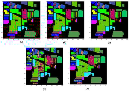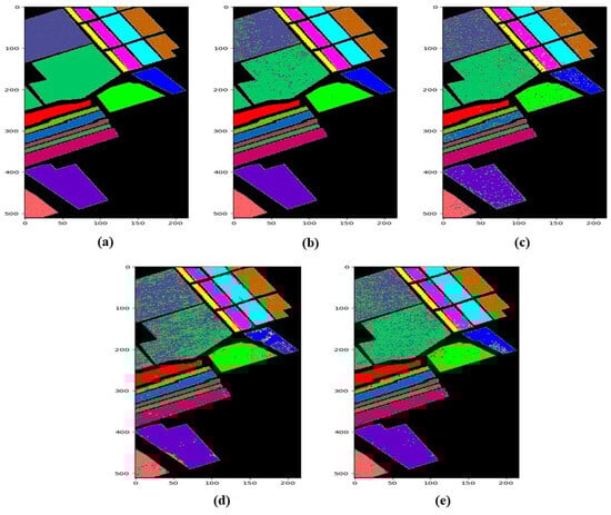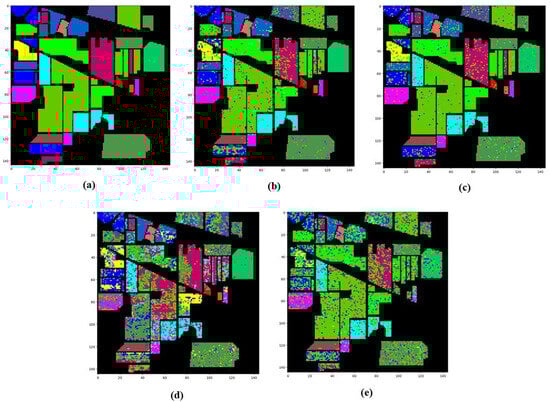 Comparison of MCCA and different ML techniques on IP (a) Ground Truth, (b) Segmentation map after SVM, (c) Segmentation map after RF, (d) Segmentation map after Naive Bayes, (e) Segmentation map after KNN.
