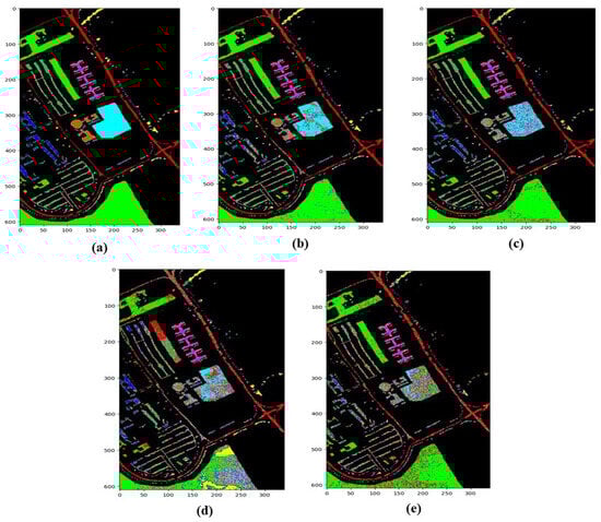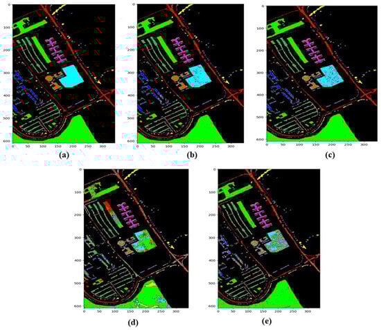 Comparison of MCCA and different ML techniques on PU (a) Ground Truth, (b) Segmentation map after SVM, (c) Segmentation map after RF, (d) Segmentation map after Naive Bayes, (e) Segmentation map after KNN.