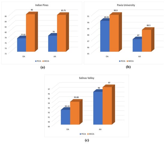By incorporating a broader spectrum of correlations, MCCA provides a richer feature space for SVM, facilitating more accurate and discriminative classification outcomes. Figure 15 highlights the improved OA and AA of MCCA with respect to PCCA.