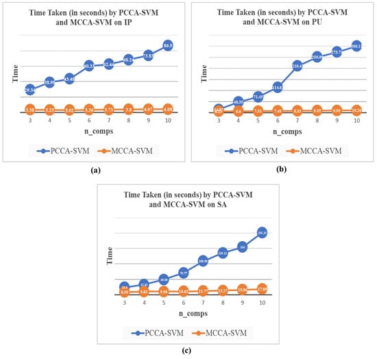Table 16 highlights the improvement in computational time of MCCA-SVM as compared to PCCA-SVM. For simplicity, No. of Components is specified as ‘n_comps’ in the Table 16. The results in Table 16 and Figure 16 have been rigorously studied and compared by varying No. of Components for all the three HSI datasets where MCCA-SVM outshines PCCA-SVM.