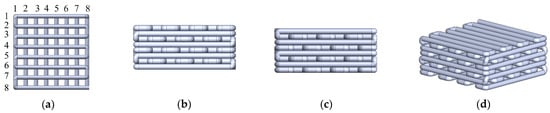 Composite bone scaffolds are fabricated using a multi-material high-precision biological 3D printer via direct ink writing technology. The printer platform is configured with various parameters, including a first-layer height set at 90%, an extrusion pressure ranging from 270 to 330 KPa, a nozzle movement speed of 2 mm/s, a nozzle temperature maintained between 45 and 55 °C, and an ambient platform temperature set at 10 °C. The design of bone scaffold models typically incorporates a large adhesive surface area for bone cells and pore shapes that enhance the circulation of oxygen, nutrients, and metabolic substances, thereby accelerating the growth rate of bone tissue cells within the porous bone scaffold []. As illustrated in Figure 1, the extrusion nozzle has a diameter of 0.6 mm, the pore spacing is 0.8 mm, and the extruded bone scaffold dimensions are 4.8 mm × 10.4 mm × 10.4 mm.