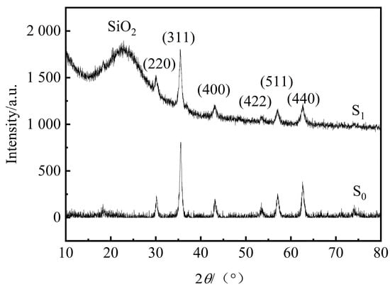 Fe3O4 nanoparticles, known for their exceptional photothermal properties, often encounter issues of local aggregation when used in conjunction with bone tissue engineering scaffolds, leading to hindered cellular growth, differentiation, and even apoptosis. To address this, SiO2@Fe3O4 nanoparticles were synthesized via TEOS hydrolysis–condensation, with the SiO2 coating offering superior biocompatibility and stability, effectively mitigating Fe3O4 particle aggregation. XRD analysis of both Fe3O4 particles (S0) and SiO2@Fe3O4 (S1) (as depicted in Figure 2) revealed diffraction peaks at 2θ = 29.8°, 35.1°, 42.7°, 52.9°, 56.4°, and 61.9°, corresponding to (220), (311), (400), (422), (511), and (440), consistent with the standard data for Fe3O4 powder diffraction. Additionally, a broad peak observed at 2θ = 15°–25° in the S1 curve may be attributed to amorphous SiO2 particles, although further testing is necessary to validate the encapsulation of Fe3O4 within SiO2. Nevertheless, the relative intensity of the Fe3O4 particle diffraction peaks in S1 has decreased, suggesting successful encapsulation by SiO2 and the formation of photothermal-sensitive nanoparticles SiO2@Fe3O4.