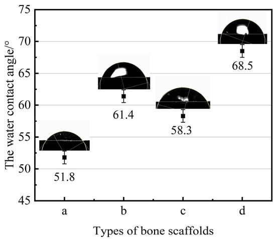 The specimens of PVA/HA/β-TCP/PCL composite bone scaffolds and 3%, 5%, and 7% photothermal composite bone scaffolds were affixed onto glass slides. Each specimen exhibited a planar surface measuring 5 mm × 5 mm × 3 mm. Subsequently, a 2 µL water droplet was dispensed onto the surface of each specimen for contact angle evaluation using a water contact angle goniometer. The contact angle readings were averaged from three replicates of the same specimen, with a standardized reading time of 5 s.