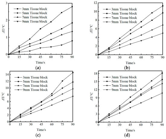 Temperature variation of composite support. (a) PVA/HA/β-TCP/PCL composite bone scaffold; (b) 3% photothermal composite scaffold; (c) 5% photothermal composite scaffold; (d) 7% photothermal composite scaffold.