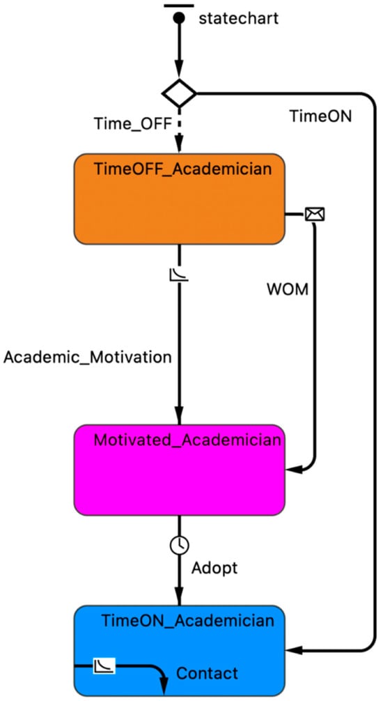 At a given time, any academician falls into exactly one of the three states (TimeOFF_Academician, Motivated_Academician, TimeON_Academician) of the following state chart (Figure 2).