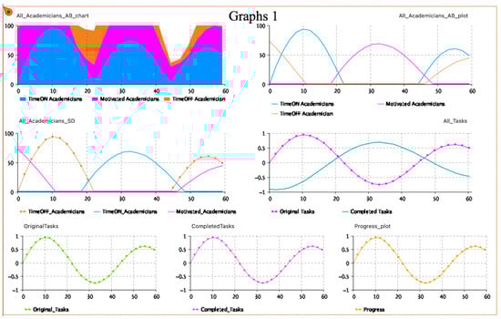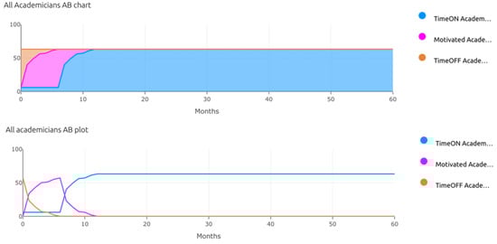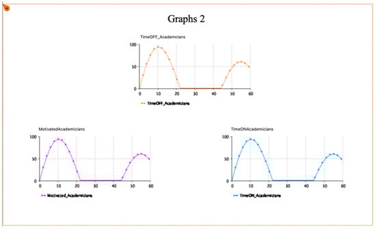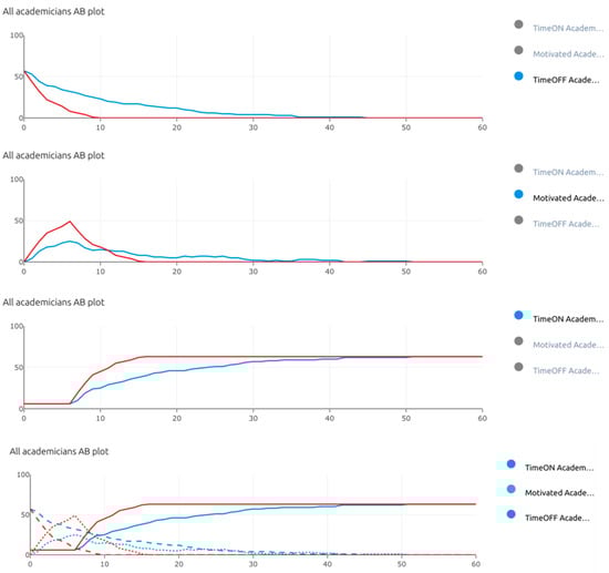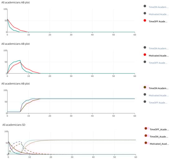 The academicians’ transition from the TimeOFF_Academician state to the Motivated_Academician and the TimeON_Academician states over time is demonstrated in the graphs of Figure 8.