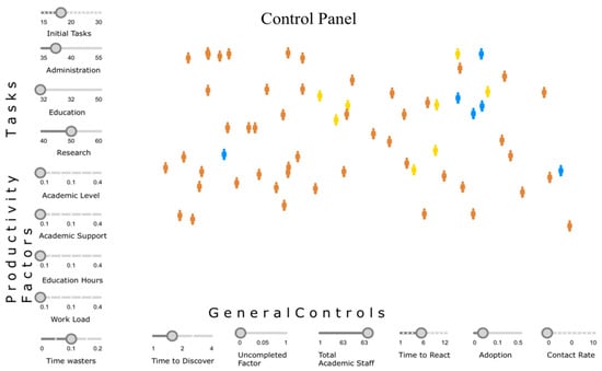 The model of the system that describes the phenomenon of the spread of time management for the Timebooster approach in dental academicians is implemented using the AnyLogic simulation software (AnyLogic Model, AnyLogic Model: https://cloud.anylogic.com/model/4b05e7b8-0b4f-4b05-941d-1daf6801ae4b?mode=DASHBOARD) (accessed 20 January 2024). To simulate, the program requires the definition of some initial settings, namely the administration, education, research, academic support, time educ hours, academic level, workload, timewasters, adoption fraction, and contact rate.