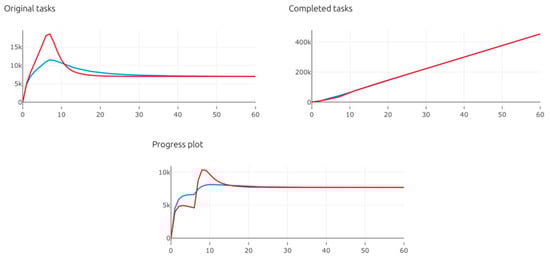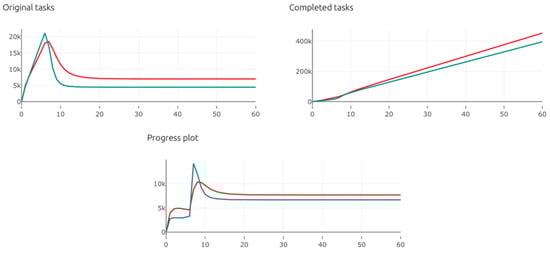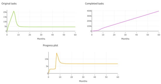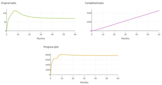 According to Table S2 (Supplementary Materials), using the B values of Table 4, all TimeOFF academicians become TimeON academicians after 16 months, while, according to Table S3 (Supplementary Materials), using the C values of Table 4, all TimeOFF academicians become TimeON academicians after 12 months. One may now observe the faster transition of the academicians from the TimeOFF to the TimeON state, as well as the larger number of motivated academicians resulting from the motivation effect due to academic factors. As a result, a higher peak can be observed in the original tasks as well as in the progress over time as shown in Figure 15, while there are fewer completed tasks due to the lower workload.