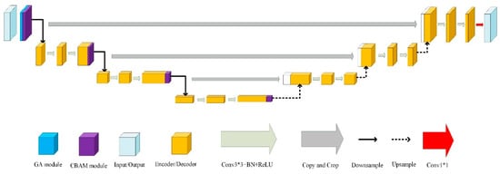 The overall structure of the proposed Ga-U-Net network, where the meanings of modules and arrows in different colors are shown in the bottom of the figure.