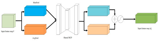 where denotes the input feature map; denotes the three-dimensional average pooling operation; denotes the three-dimensional maximum pooling operation; and denote the features from the average pooling and maximum pooling operations, respectively. MLP denotes the multilayer perceptron, is the sigmoid activation function. Finally, the output can be obtained with .