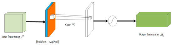 Different from the channel attention, spatial attention focuses on the locations of the effective information in the feature map, and its structure is shown in Figure 5, which mainly focuses on the relationship between different spatial locations in the feature map, and guides the network to focus on more important image regions by learning spatial weights. Specifically, firstly, two new feature maps are generated by downscaling the input feature map in spatial dimensions with 3D average pooling and 3D maximum pooling. Their channel numbers are both 1. These two feature maps are spliced together. Secondly, the spliced feature maps are subjected to convolution operation with a 7*7 convolution kernel and then activated by a sigmoid function to generate a new feature map, and then finally apply it to the original feature map. In summary, the new feature map can be defined with Equation (13):