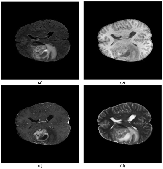 Examples of the four modalities of a case: (a–d) are the FLAIR, T1, T1CE, and T2 modalities for the case.