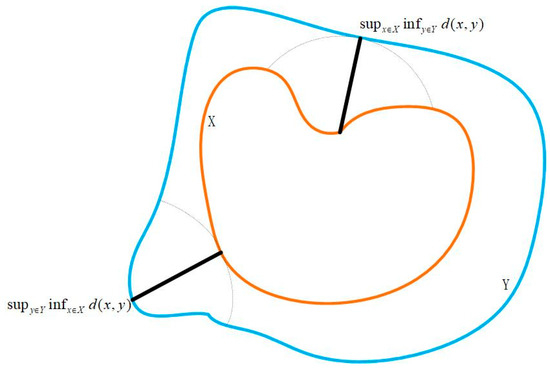 The Hausdorff distance (HD) is used to measure the distance between two point sets and evaluate the distance between a predicted edge and a real edge. A smaller value for HD usually suggests higher segmentation accuracy. In addition, the result of the 95th quantile, HD95, is used as the value of HD. Equation (15) is used to calculate HD, where denotes the Euclidean distance between , . As shown in Figure 7, and are two points from the predicted edge and the corresponding real edge, respectively.