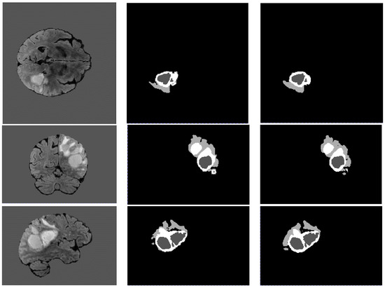 Figure 8 shows examples of the segmentation results obtained with the trained model on the BraTS 2021 dataset, with the coronal, sagittal, and horizontal planes in an order from top to bottom. From left to right are the T1 modality, the real label, and the segmentation results. From the segmentation results, it can be seen from Figure 8 that the segmentation results on the tumor core region are highly close to the ground truths with little amounts of error. However, in the enhanced tumor region (i.e., the white region), a certain amount of error exists in the coronal and sagittal planes. In addition, there is also a modest amount of error for the segmentation of the edema region (i.e., the light grey region). In general, the proposed approach is able to separate the tumor from the healthy region, and it retains more complete information from the tumor.