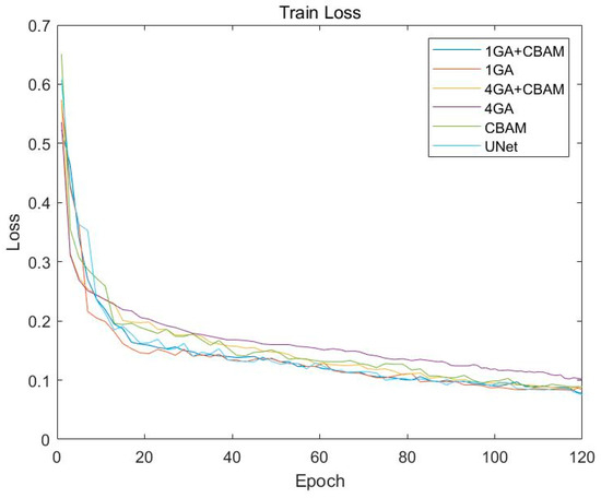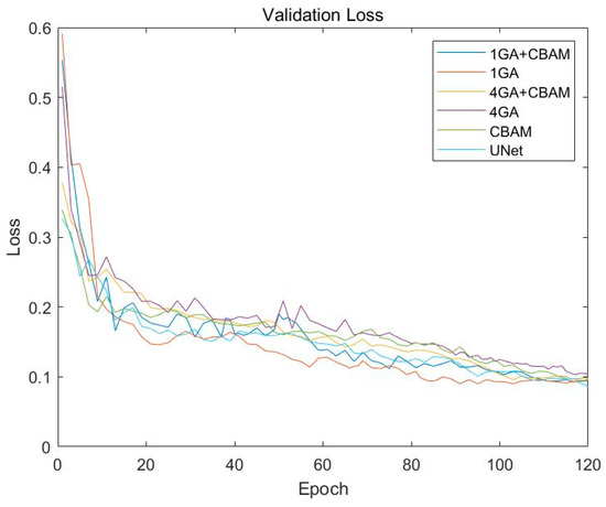 In order to verify that the Gabor convolution works better in the low-level encoder, this paper uses the 3D U-Net as the base network and adds the Gabor convolution to the low-level encoder (i.e., the network has 1 GA module) and to each layer of the encoder (i.e., the network has 4 GA modules) to test the effect. Six sets of comparison experiments are performed to test the addition of the CBAM attention mechanism after convolution to see if the segmentation accuracy can be improved. The results of the experiments are shown in Table 4, and the loss curves obtained for the training set and the validation set of the experiments are shown in Figure 9 and Figure 10.