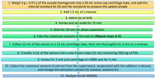 The analytical procedure was developed for the effective analysis of plant-derived foodstuffs containing a high oil content and low to moderate water content. The scheme of the method is presented in Figure 1. To do so, 3 g of oil sample was weighed into a 50 mL centrifuge tube. The sample was enriched with a working solution. Subsequently, 1.5 mL of n-hexane was added followed by 6 mL of ACN. The sample was vortexed for 15 min using a vortex mixer. The sample was then left for 20 min to allow for the separation of immiscible solvent phases. The maximum volume of solvent (15 mL) was transferred to a tube. The extraction step was repeated, and then 6 mL of ACN was added, vortexed for 15 min, and left for 20 min for phase separation. The maximum volume of solvent was again transferred to the tube (15 mL). The obtained extract was vortexed for 2 min. Then, 4 mL of the extract was transferred to a new tube, and 200 mg of PSA was added to the new tube with a volume of 15 mL. PSA is commonly employed for the removal of organic acids, fatty acids, sugars, and pigments. The tube was vortexed and centrifuged at 3000 rpm for 5 min. The maximum volume from the above sediment was transferred to a pre-washed vial and evaporated to dryness with a drop of n-decane. The dried residue was reconstituted with a mixture of toluene: acetonitrile 9:1 in a volume of 1 mL.
