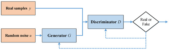 GAN [30] contains generator and discriminator in Figure 1. Random noise generates samples , which follow the actual data distribution, . The discriminator makes a distinction between real data and fake data for the input sample. Suppose is the actual data distribution of , and is the generated noise distribution of . The adversarial training between and is realized by the following: