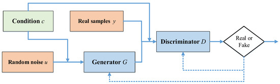 The optimization of objection function in CGAN is similar to that of GAN. is the probability of identifying real data after input data and condition are fed to discriminator ; is the probability of being real data via discriminator when random noise is combined with condition and input to generator to create samples. Figure 2 shows a simple CGAN structure.