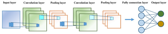 The classic convolutional neural network (CNN) [31] contains convolution, pooling, and fully connected layers, as shown in Figure 3. Output features are extracted from the output of the previous convolution layer. The number of features is decreased by feature selection in the pooling layer, commonly used in maximum and average pooling. The fully connected layer connects all the features of the previous layer, integrating the information with the categories in the pooling layer. Finally, the classifier is employed for the output of the network. Convolution is defined as follows: