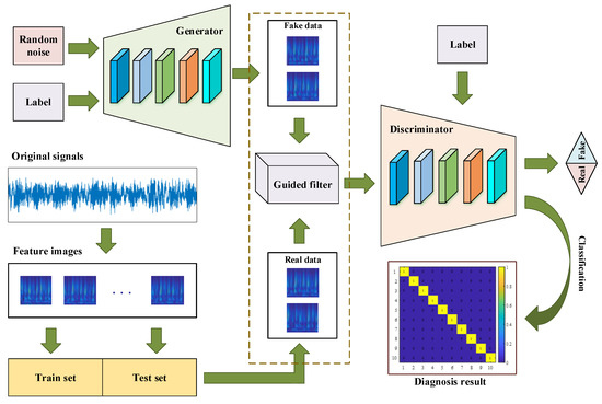 Data augmentation under small samples is a practical way to overcome the limitation above. As a prospective approach, a generative adversarial network (GAN) [18] is a semi-supervised feature-learning method using game scenarios. The GAN and its variations have been widely employed in signal formation and recognition [19]. GAN learns the distribution of previous samples and outputs satisfactory simulated ones. Thus, GAN provides a novel approach for solving the problem of unbalanced and insufficient data for actual fault diagnosis [20,21,22,23]. Recently, Wang et al. [24] presented a conditional variational GAN model for imbalance fault diagnosis that gains the distribution features from a small fault sample size. Zhou et al. [25] developed a novel GAN method via global optimization to create more fault condition data to deal with the imbalance problem, and a two-hierarchical discriminator is designed to process unqualified data. Fan et al. [26] designed a Wasserstein GAN diagnosis approach with a full attention mechanism and gradient normalization to promote the quality of the fake samples. Meng et al. [27] proposed a feasible auxiliary classification GAN methodology with Wasserstein distance and attention modules for information insufficiency. GANs are also suitable for producing two-dimensional (2D) samples. Luo et al. [28] developed an effective generator by using a time-series GAN that learns raw data and an auxiliary classifier GAN for producing multimode time-frequency maps to balance the sample distributing. Liu et al. [29] proposed a multi-scale residual GAN to generate time-frequency maps to balance an unbalanced data distribution and used a classifier based on feature enhancement for fault classification. These studies are all two-step strategies. An example is the generative training of a GAN model and another deep learning classification model that are independent. The inconsistency of sample generation and sample classification can increase the complexity of the diagnosis model.