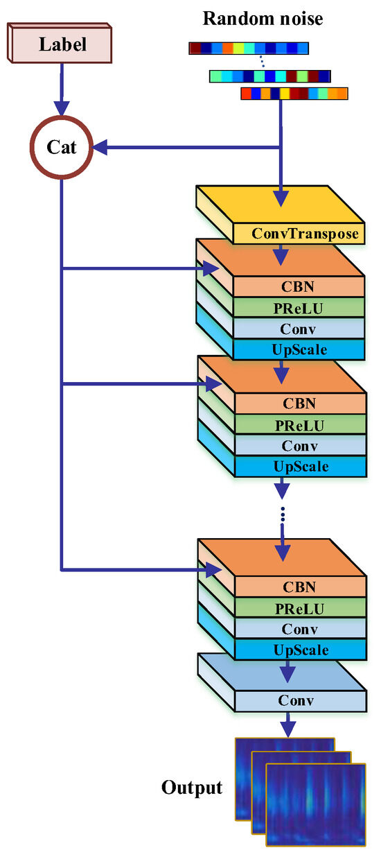 The generative model as a generator is improved to synthesize high-quality samples from the noise and class label information as input to augment and balance the unbalanced dataset. The structure of the improved generator is illustrated in Figure 5. Because the ability of convolution operation in feature extraction is excellent, the proposed generator mainly uses convolution transpose and convolution layers. Unlike the generator of the traditional CGAN, the input of each convolution block is closely linked with the label data as a fault condition to improve the guidance of the label during the learning process. Each convolution layer uses the kernel size of 3 and the step size of 1. A cross-iteration batch normalization (CBN) [34] layer is also introduced to the generator by connecting the input layer with the following layers directly instead of through a BN layer. In order to mitigate gradient loss, the ReLU function is replaced with PReLU to speed up the convergence. Finally, the synthesized samples are output through a convolution layer and hyperbolic tangent function.