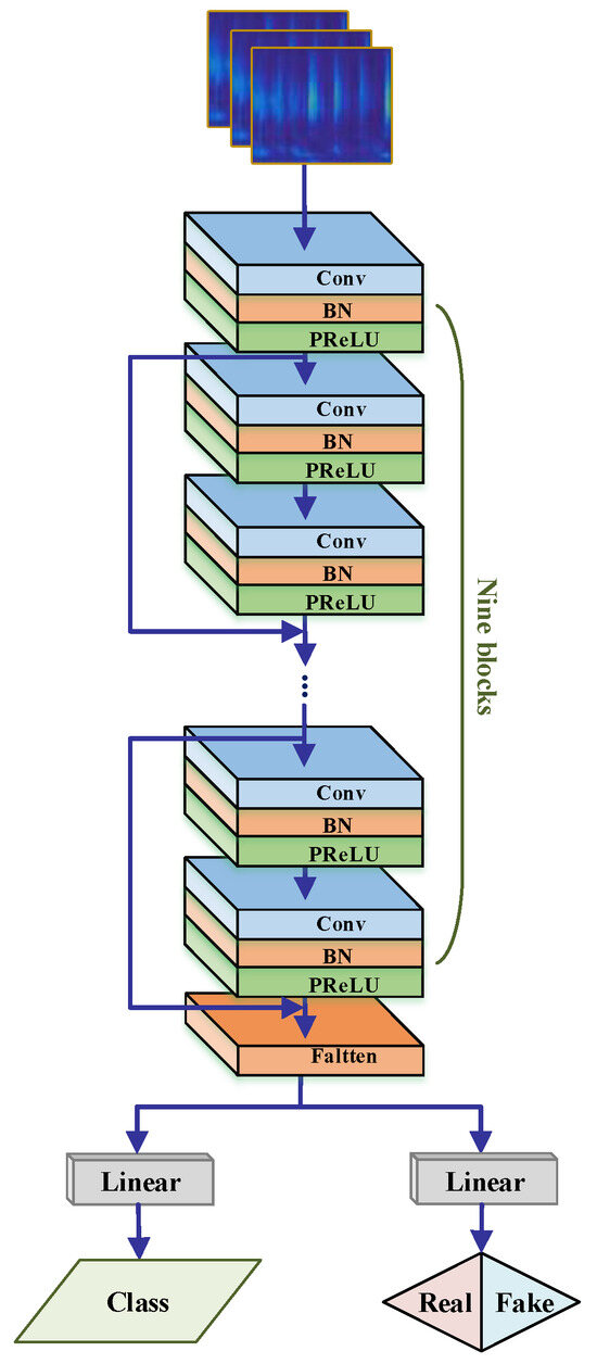 In this work, the structure of the discriminant model is used for both discrimination and classification, as shown in Figure 6. The discriminative model is constructed with the convolutional, BN, and PReLU layers to improve the model accuracy. With the increase in the network depth, the gradient disappearance and gradient explosion may degrade the model, so the skip connection is employed to make the discriminator much deeper and gain a broader field of view and greater fitting ability, as shown in Figure 6.