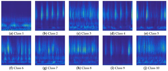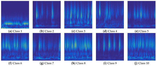 In order to ensure that each sample has at least one period of vibration data, samples are defined at 600 data points apart. For the purpose of diagnosing faults, the 1D vibration data were converted into time-frequency images. The preprocessed results of wavelet transform in the CWRU dataset are shown in Figure 7.