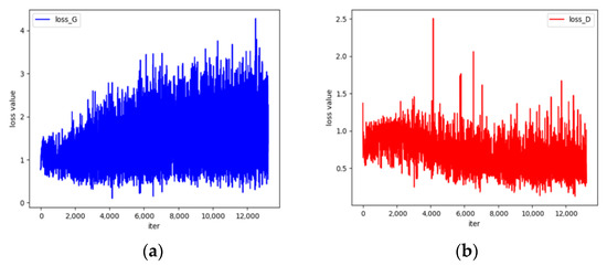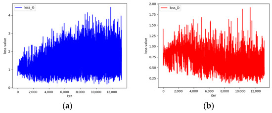 Trends of loss functions in Case I: (a) trends of the generator loss (); (b) trends of the discriminator loss of generation ().