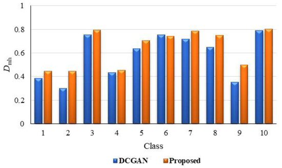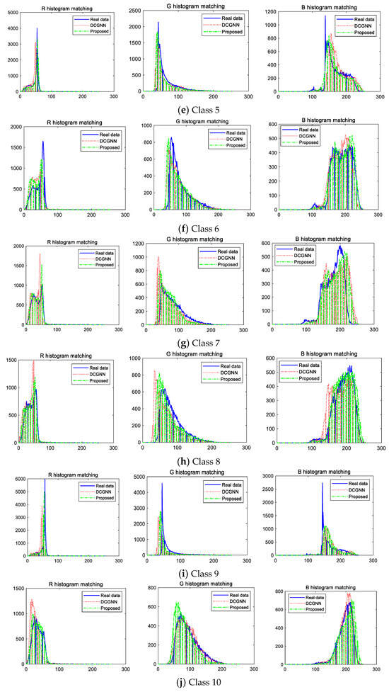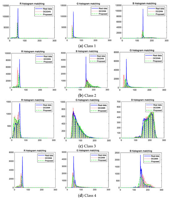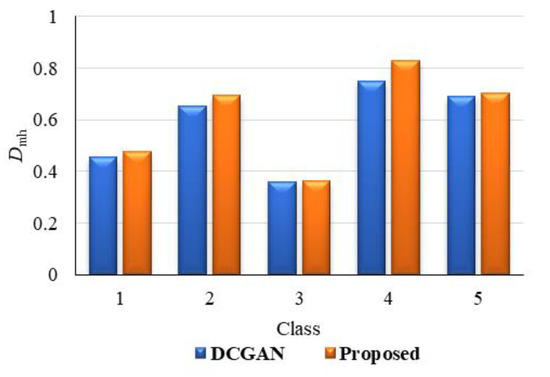 To demonstrate the method’s effectiveness, the first sample of each health condition was selected to produce a histogram with R, G, and B channels due to the generated sample similarity. DCGAN was used for the generated sample comparison, and the results of produced histograms are displayed in Figure 8. The histograms with the proposed technique are closer to the actual data than DCGAN for various classes. Although there is a small difference between the real and synthesized samples, Figure 10 also shows that the synthesized samples are learned from real data rather than simple copies. The superior results are further verified, as shown in Figure 11, by comparing the average histogram distance of the proposed model and DCGAN. It was observed that most of the proposed technique exceeded DCGAN. It was demonstrated that the effectiveness of the synthesized samples using the proposed method was satisfactory.