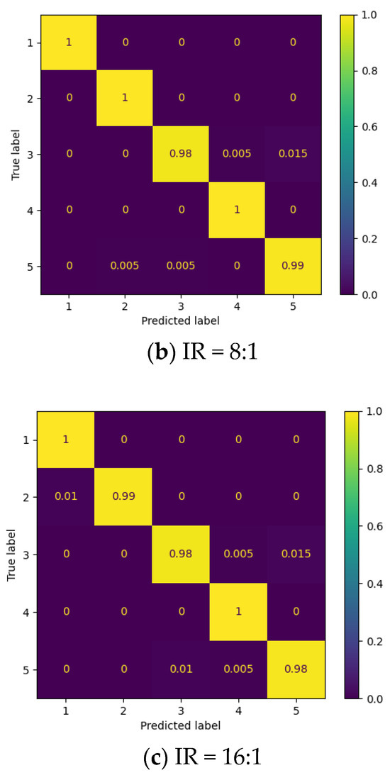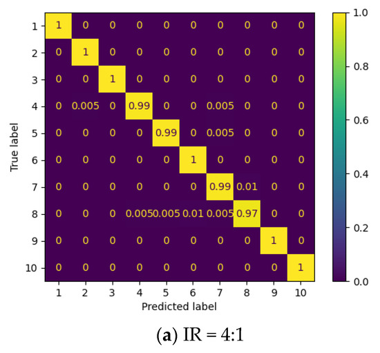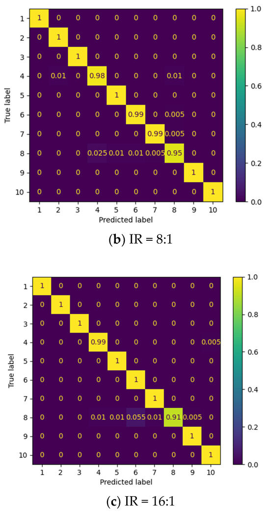 The learning rate was set to 0.0002 in the Adam optimizer for the classifier. The multi-class confusion matrixes of the output and the three IRs are displayed in Figure 12. The train samples are augmented as a sufficient dataset. For exploring the advantages of the proposed algorithm in fault classification, three compared classifiers were trained separately with the augmented samples for comparison. The data were normalized before training. Table 2 compares the four classifiers with various imbalance ratios in four general metrics: recall, precision, F1, and accuracy. For the classifier, the average diagnostic accuracy reached more than 99.10%. When IR = 8:1, the accuracy of the proposed method matched ResNet18, but the precision of the proposed method was slightly higher. Table 2 demonstrates that the proposed method is superior, as determined by all the metrics, to other methods for 10 fault states. Therefore, the proposed method can effectively improve the accuracy and stability of fault diagnosis under the condition of imbalanced samples.