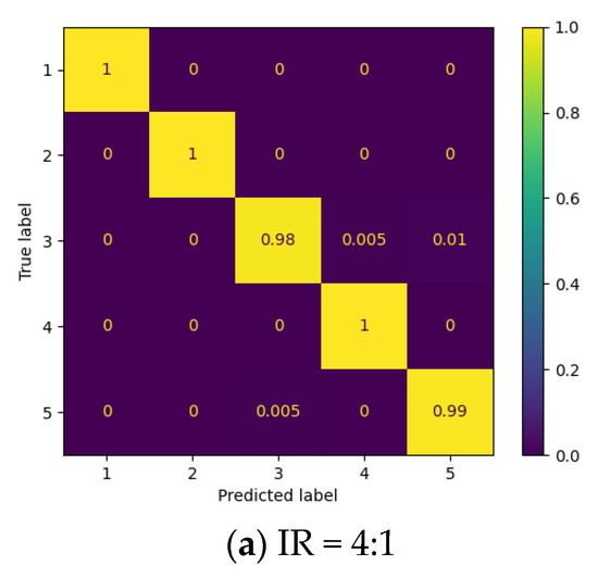 The multi-class confusion matrixes of the output with the three IRs are presented in Figure 15. We can see that the accuracy is more than 99% in each IR. The normal class (No. 1) can achieve 100% accuracy, so the proposed method can completely identify the normal and other failure classes. The results show that the method of synthesizing samples can effectively reduce the misjudgment rate under the condition of imbalanced samples. To verify the superiority of the proposed approach for fault classification, the three mainstream classifiers mentioned above were also used. It can be found in Table 4 that the proposed approach is superior to other classifiers, according to the four metrics, manifesting the feasibility of the improved method. The accuracy of the model decreases with the increase in imbalance ratio. However, the classifier has no remarkable advantage over ResNet18 and AlexNet, especially in the accuracy of IR = 4:1. It is convenient to use the self-owned discriminative model as the classifier to avoid designing another classifier. It proved the effectiveness and practicability of using the proposed approach to realize diagnosis of the gearbox dataset.