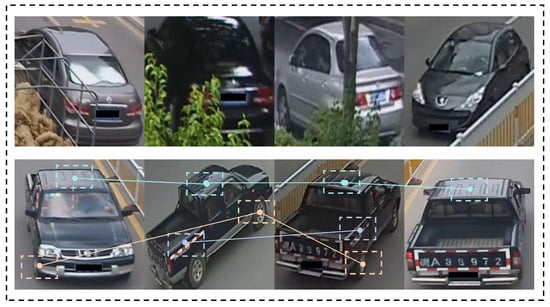 Vehicle re-identification (ReID) has increasingly become a focal task due to its significant applications in intelligent transportation systems [,,,,]. The aim of vehicle ReID lies in recognizing all instances of a specific vehicle across various camera viewpoints. Substantial progress has been made in this domain, where a common approach involves the construction of feature representations for each vehicle image, followed by the calculation of similarity rankings between these images based on the computed feature distances. Unlike person ReID, the primary challenge in vehicle ReID stems from the rigid structure of vehicles, which results in excessive similarity among different vehicles from the same viewpoint and considerable variance for the same vehicle across different viewpoints.