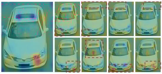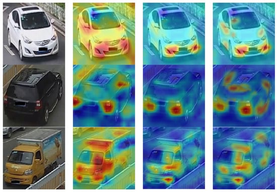 Besides orientations, some previous works address vehicle re-identification problems by exploiting local details and regions [,,]. Meng et al. [] design a parser to segment four views of a vehicle and propose a parsing-based view-aware embedding network to generate fine-grained representations. To address the near-duplicate problem in vehicle re-identification, He et al. [] propose a part-regularized approach that can enhance local features. Liu et al. [] introduce a multi-branch model that learns global and regional features simultaneously. In [], ratio weights of regional features are adaptively predicted for the fusion process. Furthermore, to optimize the distance within and across vehicle image groups, a Group–Group loss is also proposed. Shen et al. [] propose a two-stage framework which incorporates important visual–spatial–temporal path information for regularization. Khorramshahi et al. [] present self-supervised attention for vehicle re-identification to extract vehicle-specific discriminative features. However, these methods may only identify too small discriminable regions and thus reduce the generalization of the network. We visualized the feature map of IBNnet [], a commonly used backbone network of these methods. As shown in the left column of Figure 2, the network pays too much attention to the position of the car lights. In this paper, we also utilize discriminative regions to improve the re-identification accuracy. Specifically, a region mask is generated to highlight vehicle details. Note that no additional manual annotation is involved in this process.