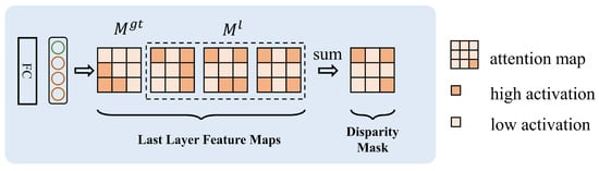 In this section, we introduce the construction principles and methodologies for the nuance–disparity masks, which are automatically generated by the network. These masks are designed to adaptively mine a broader spectrum of discriminative regions within vehicle images while concurrently suppressing extraneous information. The nuance mask is specifically engineered to augment the network’s capability to recognize a more comprehensive set of target features, whereas the disparity mask focuses on mitigating background interference. This enables a refined focus on essential details critical for effective vehicle identification. The N&D mask generation process is shown in Figure 3.