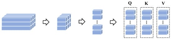 where . The length of the spliced vector is , and the length of each vector in MultiHead(Q,K,V) is . Therefore, the shape of features remains unchanged after the self-attention process. The construction details of RA module are shown in Figure 4. In the framework, we add the relation module after the backbone.