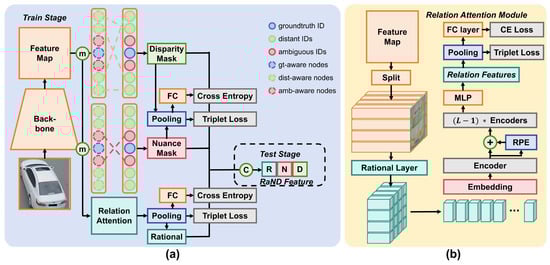 Addressing these challenges necessitates a framework capable of mitigating background and foreground occlusions; discerning multiple discriminative regions; and learning adaptive, viewpoint-related structural information without extra labeling. In response, we propose a vehicle ReID network endowed with relation attention mechanisms and nuanced and disparity masks. The proposed network is based on the following phenomenon: “Simple negative classes”, which differ markedly in vehicle model and color from the target and tend to activate at unrelated aspects such as background or foreground occlusions during training. In contrast, “hard negative classes”, which share similar vehicle models, focus on car emblems, headlights, or tire regions. Through the intersection of class activation maps from both simple and hard negative identities, we discern vehicle background and sub-discriminative regions, encapsulated in the disparity mask and nuance mask, respectively. Furthermore, our relation attention module, leveraging an enhanced transformer architecture, facilitates self-attention across vehicle component information, distilled into patches from each feature map unit, fostering a network understanding of the inter-relations among vehicle components. This methodology adeptly minimizes intra-class distances across varying viewpoints of the same ID, requiring no additional data beyond vehicle IDs for network training. Our approach achieved a SOTA performance on VERI-776 and VehicleID datasets.