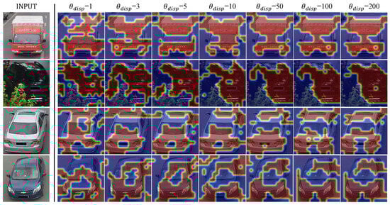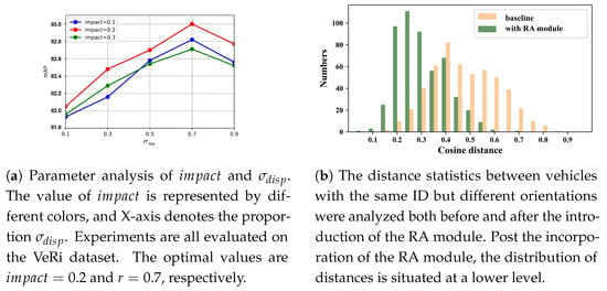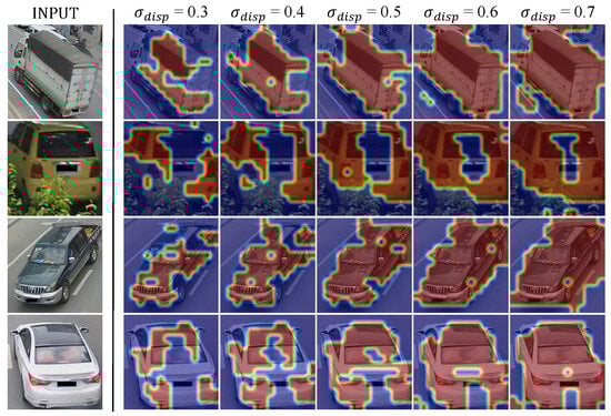 Regarding the parameter , which controls the area of the rigid body in the image, we consider the vehicle’s proportion within the image. Extreme proportions, i.e., too small or too large, are deemed impractical and are therefore excluded. Empirical tests with and were conducted. The visual results, displayed in Figure 7, clearly show that as increases, the mask progressively encompasses the entire vehicle body. The impact on re-identification is illustrated in Figure 8a, where the X-axis and Y-axis represent the proportion and the mAP evaluated on VeRi-776 [], respectively. Initially, an increase in correlates with a rise in the mAP, peaking at . However, further escalation in leads to a decline in accuracy. This is attributed to the fact that a smaller challenges the N mask’s ability to learn all details, while a larger risks including irrelevant background elements in the D mask.