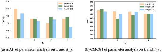 Results from the parameter analysis concerning the number of self-attention modules L and feature length are presented in Figure 10a,b. The chosen values for L in our experiments are 1, 2, 3, and 4, while for , they are 128, 256, and 512. These experiments reveal that the highest accuracy is achieved with , and the impact of varying values appears to be inconclusive.