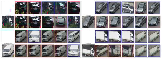 However, these methodologies, despite their effectiveness, do not fully resolve all issues. As shown in Figure 1, approaches emphasizing local features—such as stickers on the front window or the view of the interior through it []—aid in differentiating between similar vehicle models but may become ineffective due to occlusions or changes in viewpoint because these features do not always appear in images from all viewpoints. Attempts [,] have been made to counter the loss of critical features by increasing the weight of viewpoint-independent features or concatenating an extra feature vector representing the vehicle direction. However, these solutions either require additional hard-to-obtain information or their discriminative capability for learned features is often insufficient to differentiate similar vehicle models. For instance, DFnet [] uses directional labels to learn specific orientation-related features and attr-net [] focuses on body color or vehicle model attributes as viewpoint-independent features. Most of these methods use IBNnet [] as the backbone network.