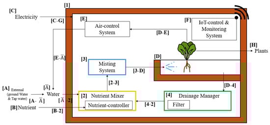 Figure 1 provides a structural overview of the smart farm system developed in this study. Additionally, Figure 2 shows the system in operation. This system takes in water ‘A’, nutrients ‘B’, and power ‘C’ from external sources to facilitate the growth of plants ‘H’. The enclosed structure ‘1’ creates a uniform and controllable growth environment, ensuring independence from external climate variations. Water within the system circulates through two paths, enabling efficient use of water and reuse of nutrients for hydroponic cultivation. The supplied water ‘A’ and nutrients ‘B’ are mixed in the right proportions by the Nutrient Mixer ‘2’ to form the nutrient solution needed by the plant roots. The Misting System ‘3’ delivers this solution as fine droplets to the roots located in the growing beds ‘D’. Excess solution not absorbed by the roots is collected by the Drainage Manager ‘4’, goes through an internal filter, and is recirculated, with the purified water ‘’ being reused to make more nutrient solution. The plants use the absorbed water and nutrients in their metabolic processes, and the water vapor released through transpiration in the leaves is captured by the Air-control System ‘E’ and recycled back into liquid form.