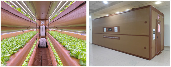 Operation of crop cultivation after installation of the closed-system smart farm with air injection. The left image shows the interior view of the smart farm, highlighting the organized layout and efficient use of space for optimal plant growth. The right image shows the exterior view of the smart farm, demonstrating its compact and enclosed design, suitable for various indoor environments.