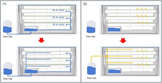 The proposed inflatable enclosed smart farm system in this study adopts a frame maintenance technique reliant on air pressure to minimize structural load. This approach is evaluated to have excellent interoperability with aeroponic methods, which are less sensitive to load compared to other techniques, such as the Deep Flow Technique (DFT) or Nutrient Film Technique (NFT). As depicted in Figure 3, the system employs two types of circulation methods to optimize water use and minimize wastewater production. The first method involves recirculating the nutrient solution not absorbed by the roots in the form of mist. The second method recycles the water vapor transpired by the leaves and absorbed by the roots within the enclosed environment, using an air circulation system that captures and reuses atmospheric moisture. Nutrient circulation is critical for managing the nutrient mix, spraying, and drainage, while air circulation depends on an HVAC system to reuse the moisture in the air. This study focuses particularly on nutrient circulation, offering specific enhancements, and both circulation methods are utilized in experiments to collect and analyze data on water use efficiency. The nutrient circulation system is configured as shown in Figure 1, linking the Nutrient Mixer ‘2’, Misting System ‘3’, and Drainage Manager ‘4’.