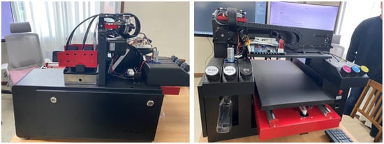 The nutrient mixer hardware system, designed for precision nutrient formulation, utilizes a modified common printer setup as depicted in Figure 4. The system incorporates an Epson XP600 print head (Seiko Epson Corporation, Suwa, Japan) and a motherboard equipped with a Xilinx ZYNQ XC7Z010 processor (AMD, Santa Clara, CA, USA), capable of managing six different types of nutrient fertilizers. Each type of fertilizer, as specified in Table 1, is mixed with distilled water and filled into cartridges measuring 18 cm × 5 cm × 8 cm, each holding up to 720 milliliters.