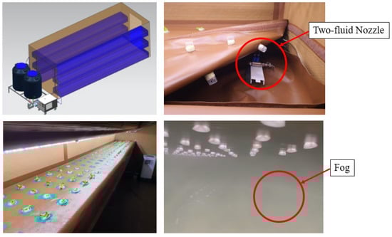 The study employs a two-phase nozzle spray system, commonly used in industrial settings for dust removal and in agriculture for pest and disease control [42]. As illustrated in Figure 5, these nozzles operate by generating a mist through the supply of water at low pressure under a constant air pressure setting [43]. Installed within the inflatable enclosed smart farm’s cultivation area, this system explores the efficacy and potential improvements of using ‘dry fog’ mist for cultivation. By maintaining uniform and continuous humidity conditions within the growing environment, the system optimally hydrates plant roots, significantly enhancing the efficiency of hydroponic farming.