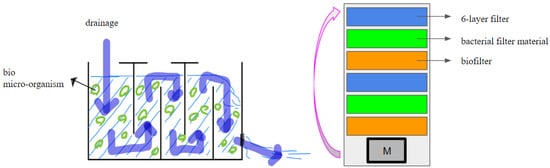 Design structure of the biofilter and conceptual diagram of biofilter implementation. The left image depicts the internal layout of the biofilter, showing the flow of drainage and the action of bio microorganisms within the system. The right image provides a detailed view of the multi-layered filtration system, including a 6-layer filter, bacterial filter material, and the biofilter itself.